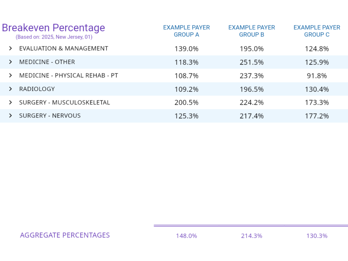 payer agreements against one another for an apple-to-apple comparison. Create breakeven scenarios by level-setting your payer agreements to a contracting base year, including any year/state/locality of Medicare or a proprietary fee schedule. Identify procedure codes that drive revenue and their specific payer allowables.